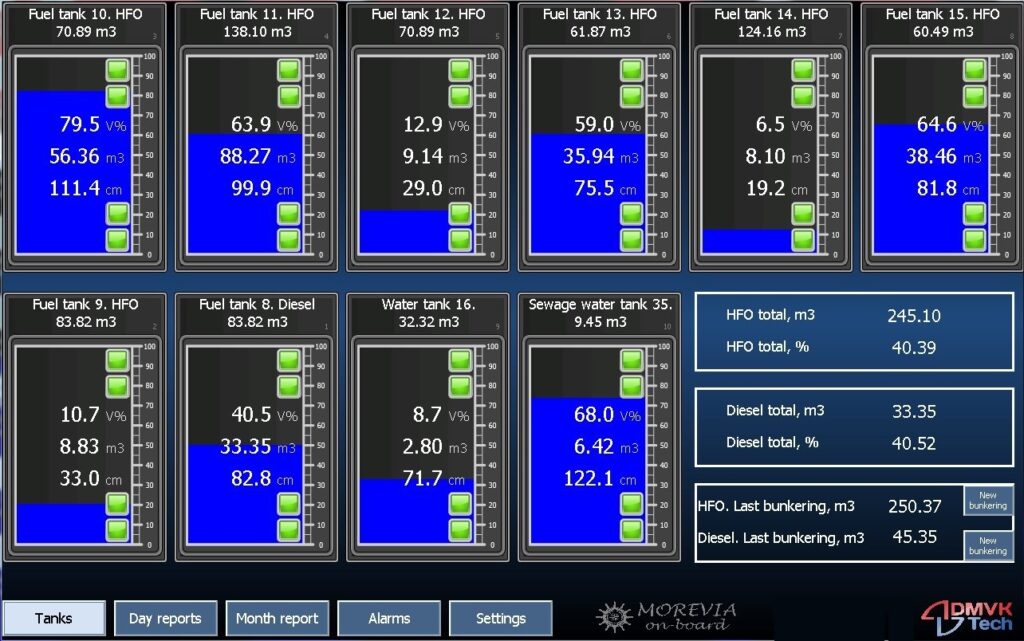 MOREVIA system can work with a large number of tank level gauging sensors, including hydrostatic, ultrasonic, microwave sensors. Additionally, there is an option of temperature, pressure and density measurement. The data is displayed in volume percent, centimeters, cubic meters. Constant monitoring of tank filling and emptying is provided. By using the integrated system, it is possible to connect tank filling level with the operation of additional equipment (for instance, turn off the pump or close the valve).