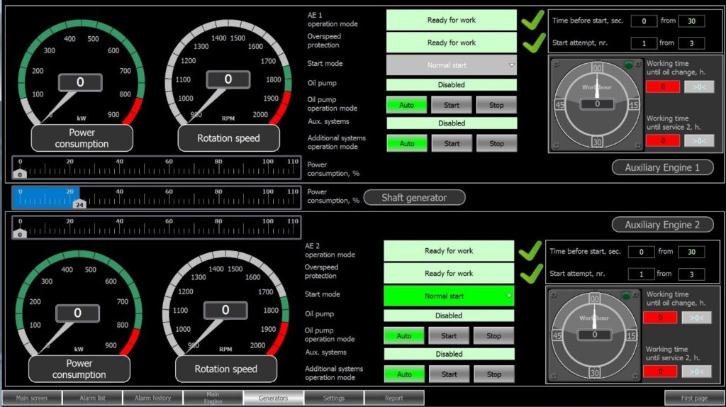 - Ühe või mitme DG juhtimine, kuvades kõik andmed ja seisukorrad monitoril (pinge, sagedus, vool, kW, cos φ, temperatuurid jm.)