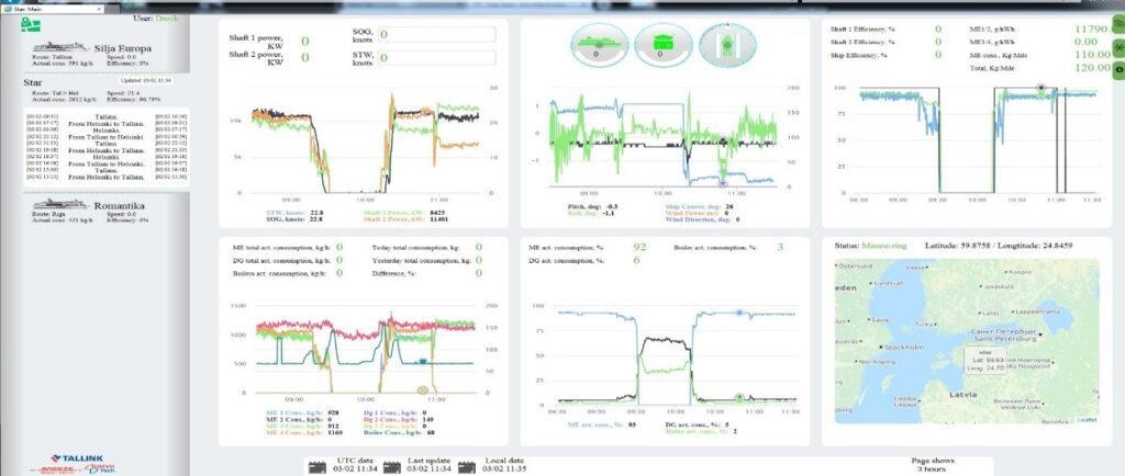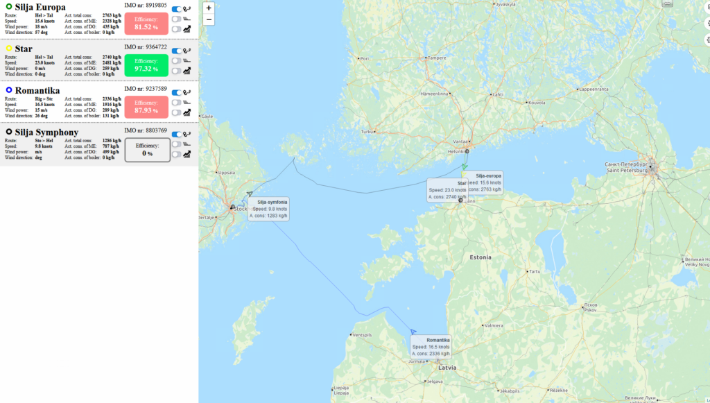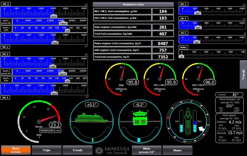 Доступны все данные о расходах, скорости, направлении, силе ветра, эффективности и местонахождении судна. Все передаваемые данные отображаются как в графическом виде, так и в цифровом виде. Судовладельцы или их представители с допуском могут сравнивать работу судов, используя удобную графическую форму сравнения, на которой возможно отображать абсолютно все (или выборочно) данные с системы Morevia. СМФ особенно удобна для судоходных рейсовых компаний, совершающих рейсы по одним и тем же направлениям, например, паромные сообщения.